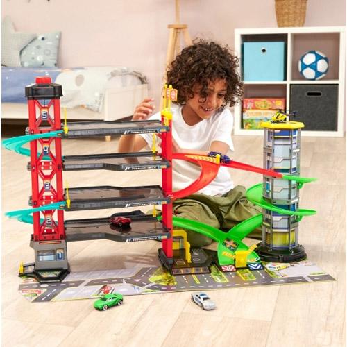 Large 5-story garage with an elevator, racetrack, toy cars, helicopter, sounds and lights.