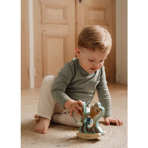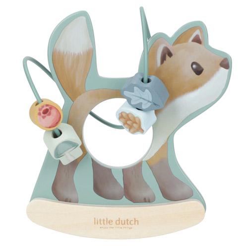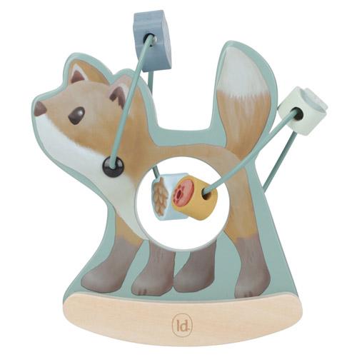 Faites tourner les perles une à une autour du petit renard en bois qui se balance d'avant en arrière.