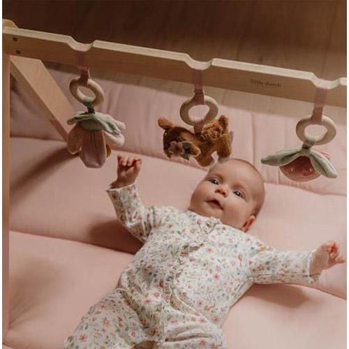 Il y a trois jouets d'activités différents pour prolonger le plaisir, notamment un joli cerf, une fraise et une fleur colorée.