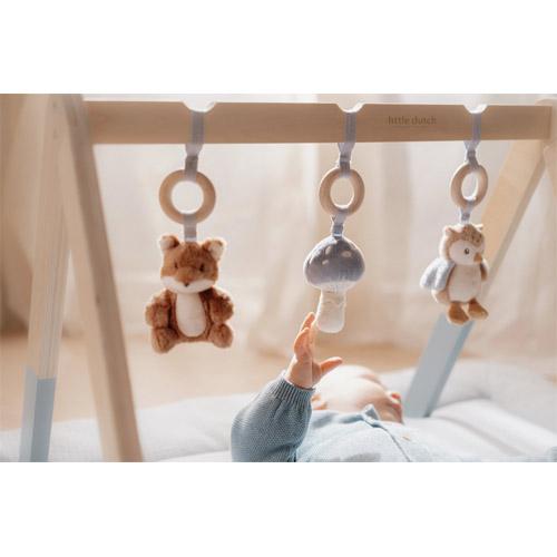 Il y a trois jouets d'activités différents pour divertir les enfants : un renard mignon, un hibou sage et un champignon.