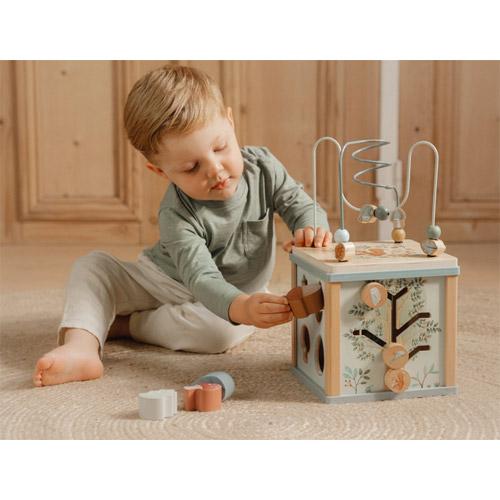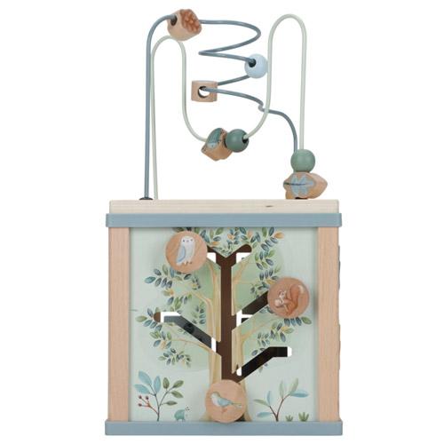 Chaque face contient des éléments enchanteurs du thème des amis de la forêt et propose des activités éducatives amusantes, telles qu'une baguette à formes, des engrenages, des puzzles et, au sommet, une spirale de perles.