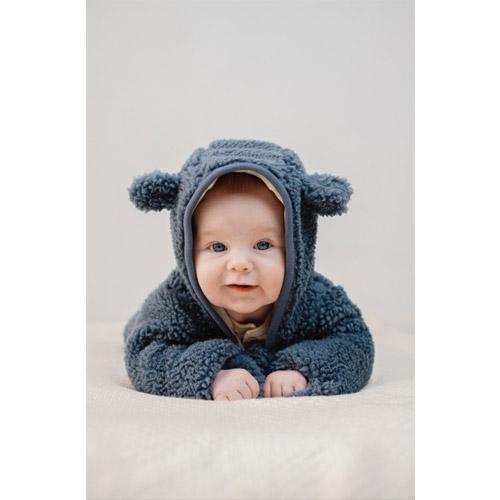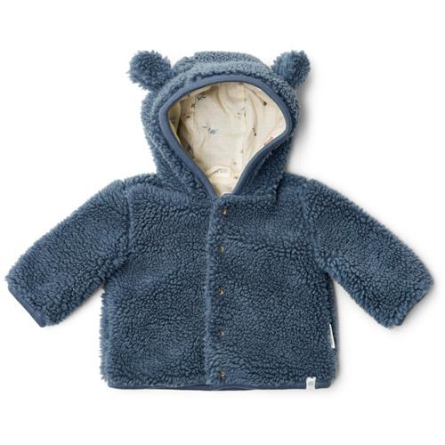 Het is net zo warm als comfortale en heeft een Stone Blue teddy stof met lieve oren op de capuchon.