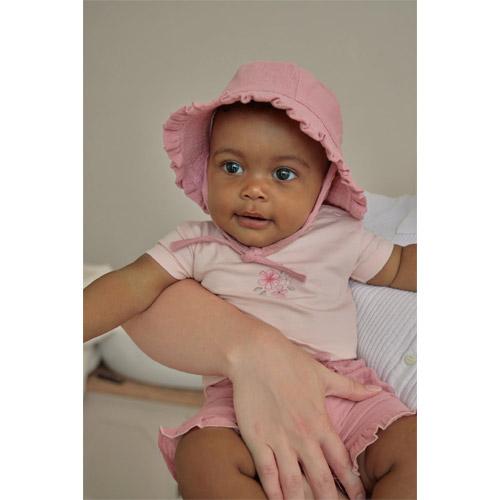 Deze lieve zomerhoed beschermt je kindje tegen de zon en voelt heerlijk zacht aan.