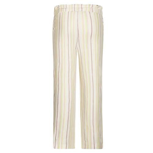 De broek heeft wijde pijpen en is voorzien van een all-over streepdesign in off white, lichtgroen en paars.