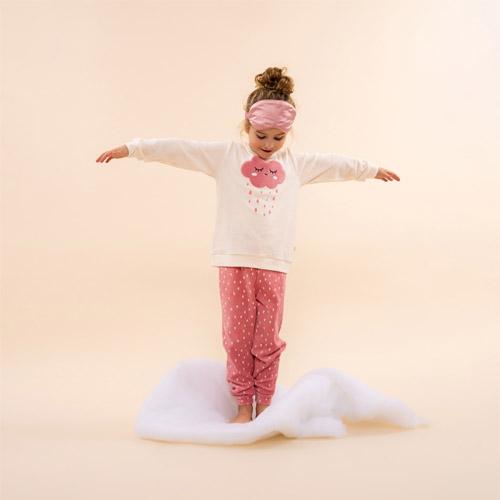 De trui met een schattige roze wolkjesprint en de pyjamabroek met speelse druppels maken van elke avond een dromerig moment vol comfort en gezelligheid.
