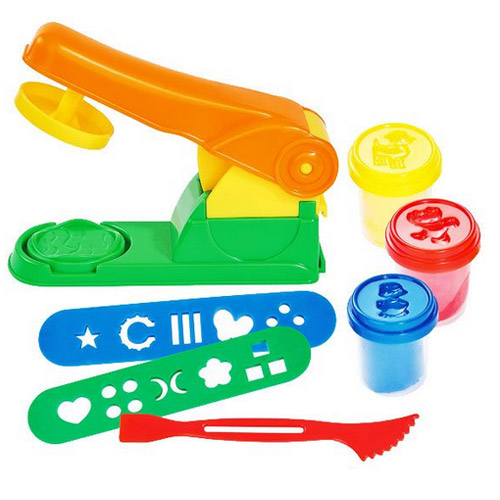 De doos bevat 3 verschillende kleuren klei: geel, rood en blauw, een kneedpers met twee sjablonen en een plastieken mes.