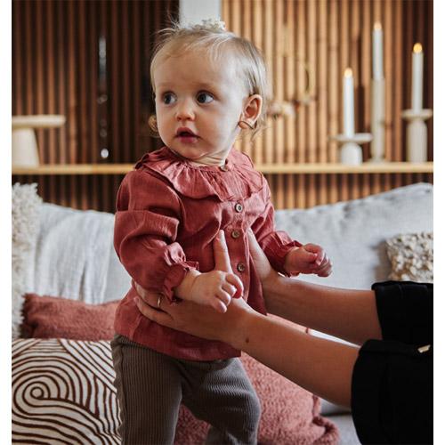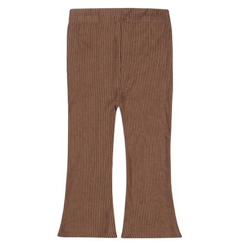 Deze bruine geribde Dirkje broek voor meisjes heeft trendy wijde pijpen en een fijne pasvorm.