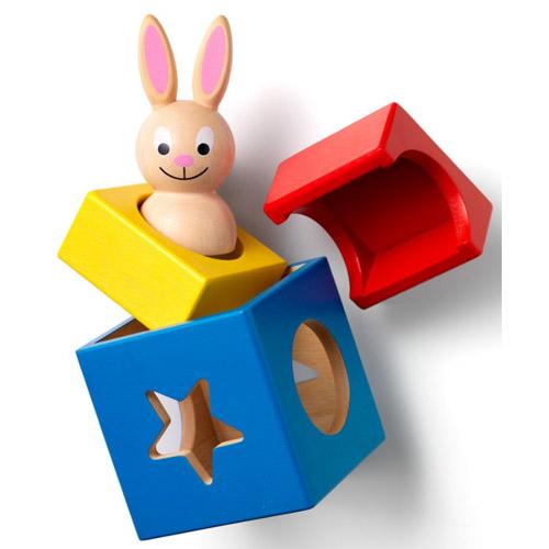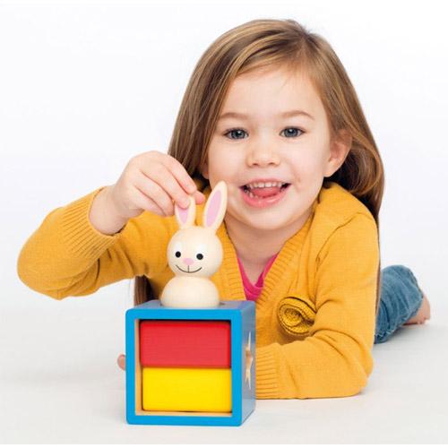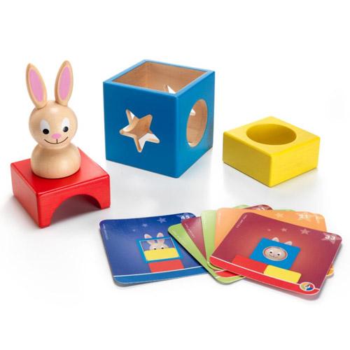 Dans la boîte : lapin en bois, 3 grands blocs, livret d'énigmes, dépliant avec les solutions.