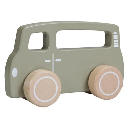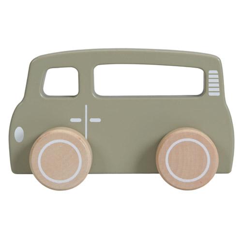 D'une belle couleur olive, ce bus Little Dutch roule joyeusement avec ses roues robustes en bois.