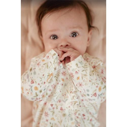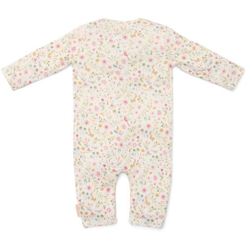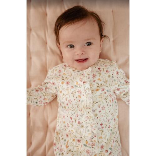 Cette adorable combinaison une pièce est ornée de jolies fleurs et d'adorables créatures des bois, telles que des écureuils espiègles et de beaux oiseaux.