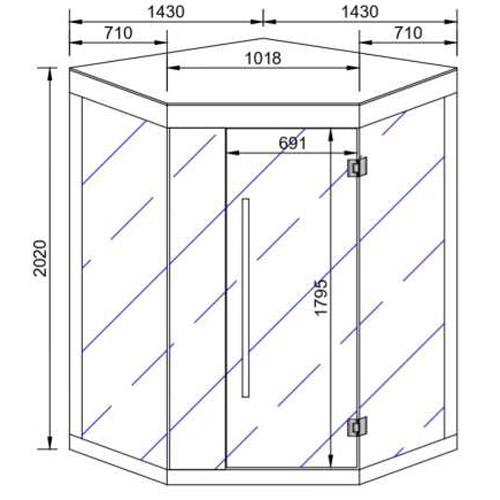 - Heldere veiligheidsglasfront met deur 1790 mm x 691 mm x 8 mm inclusief RVS hang- en sluitwerk.