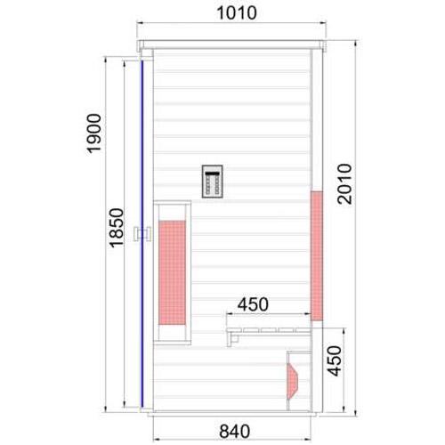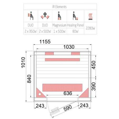 - Duo stralers in de voor- en achterwand, magnesium straler voor de benen en vloerverwarming.