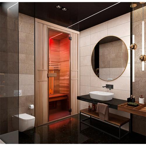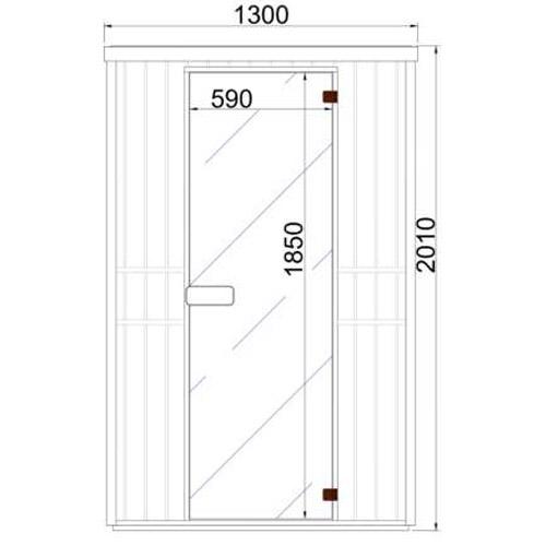 - Getinte veiligheidsglasdeur 1850 mm x 590 mm x 8 mm met bruine scharnieren en cederhouten handvat.