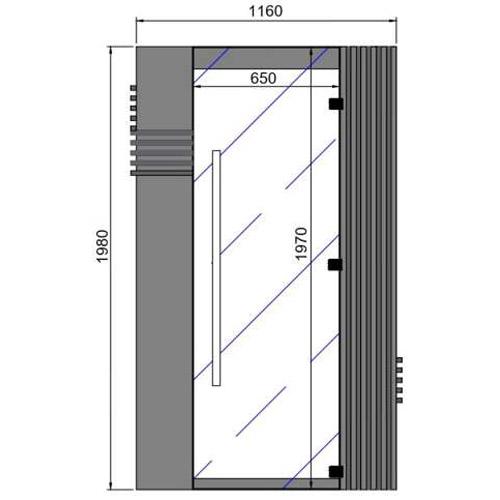 - Heldere deur uit veiligheidsglas 1970 x 650 x 8 mm met gelakt hang en sluitwerk in overeenstemming met de MDF kleur.