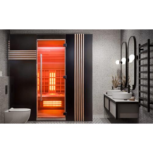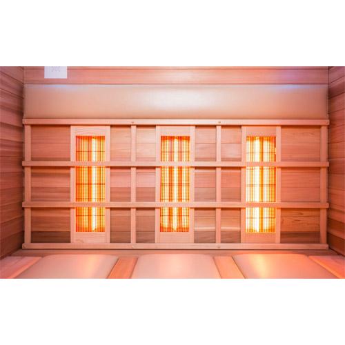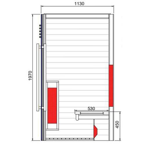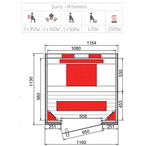 - Quartz stralers met rood bevlokte roosters, vloer- en zitbankverwarming.