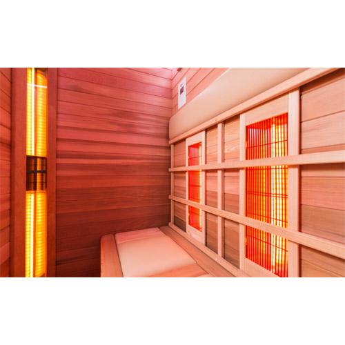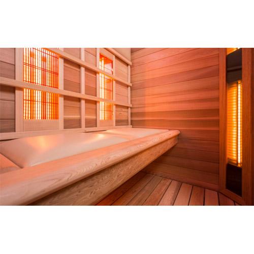 - Bank, ergonomische rugleuningen en vloer in Canadese red ceder, kunstlederen hoofdsteunen en zitkussens.
