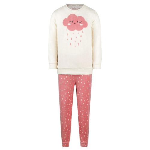 De trui met een schattige roze wolkjesprint en de pyjamabroek met speelse druppels maken van elke avond een dromerig moment vol comfort en gezelligheid.