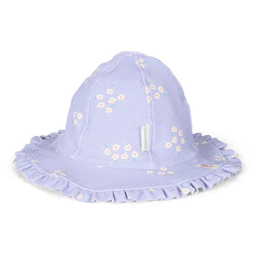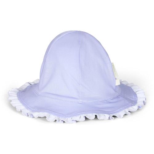De zachte lavendelkleur en het lieve ruflle randje geven dit hoedje een dromerige uitstraling - net alsof je kleintje door een veld vol met bloemen huppelt.