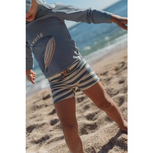 Deze blauw wit gestreepte zwembroek Ocean Blue Stripes is perfect voor kleine waterliefhebbers die houden van comfort en bewegingsvrijheid.