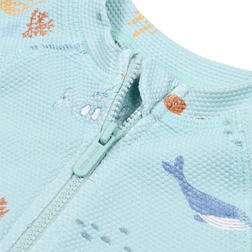 De lange mouwen beschermen de gevoelige armen tegen de felle zonnestralen, terwijl het speelse ontwerp met vrolijke onderwaterdiertjes zorgt voor een glimlach bij elke duik.