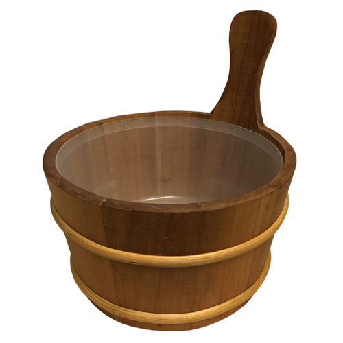 Sauna-emmer van thermisch behandeld espenhout met houten rand en kunststof inzetstuk.