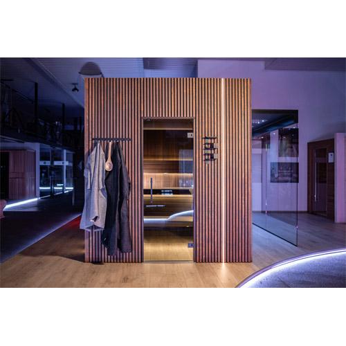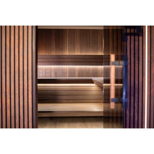 De saunacabine bevordert de bloedsomloop en de ademhaling, vervaardigd uit duurzaam hout.