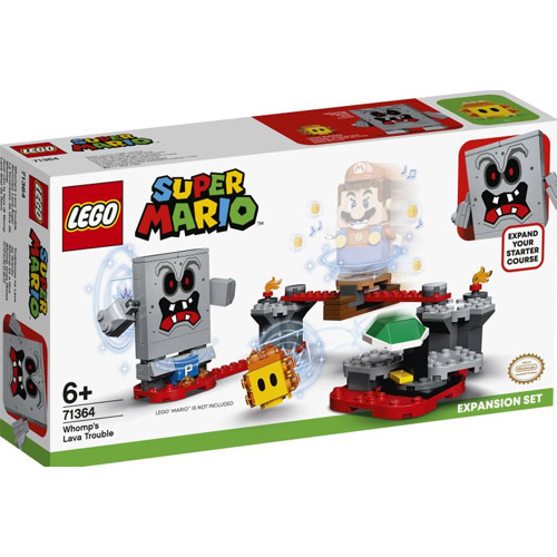 Deze modulaire Lego Super Mario speelset bevat een schuifplatform, een Whomp figuur die een p-schakelaar (alleen in deze set!) bewaakte en een schilvormig systeem van stenen om de Lava Bubble figuur omver te gooien.