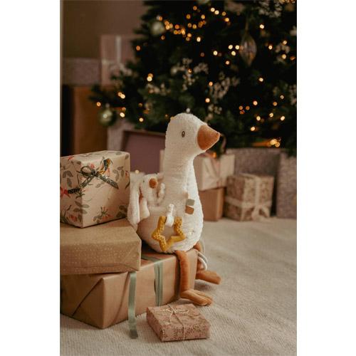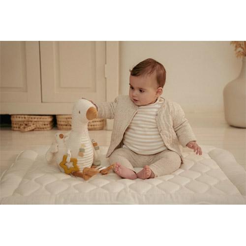 Dit speelse gansje prikkelt de zintuigen met zachte stofjes, rammelende geluidjes en speelse labeltjes.