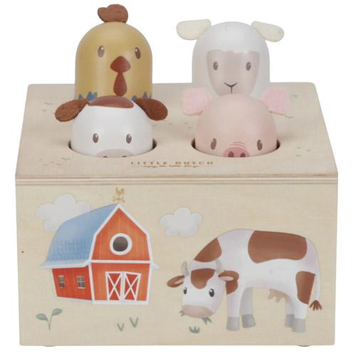 Het stevige houten doosje van dit interactieve pop-up speelgoed is versierd met vriendelijke illustraties van Little Farm, ontworpen om de verbeelding van jouw kleintje te prikkelen.
