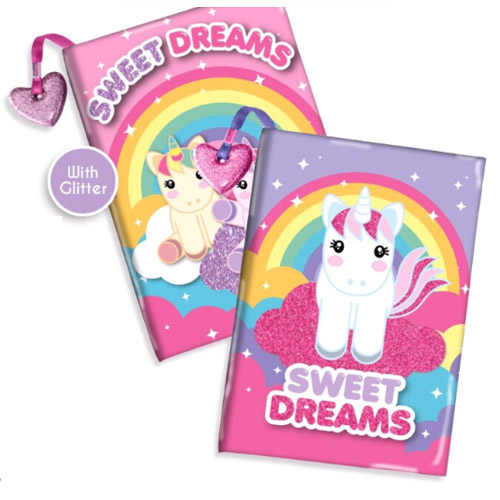 Het notitieboek heeft een regenboog kaft en voorzien van een afbeelding van een eenhoorn afgewerkt met echte glitters!